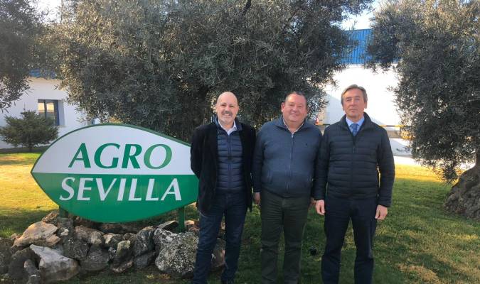 En la imagen, el alcalde de La Roda de Andalucía, Fidel Romero, el Secretario General de la Asociación de Exportadores e Industriales de la Aceituna de Mesa (ASEMESA), Antonio De Mora y el Director General de AgroSevilla, José Ignacio Montaño. / El Correo